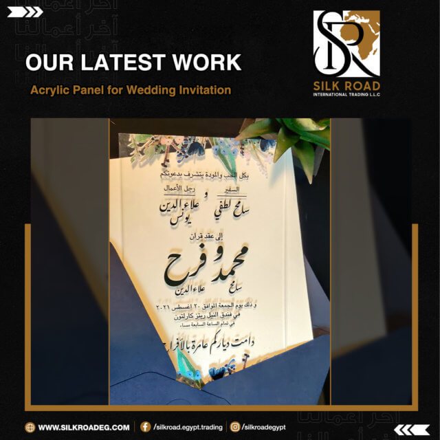 Silk Road Egypt2021-09-29T10:39:22+02:00 Previous Work Description Acrylic Wedding Invitation Luxury Unique– Color scheme, wording, and font can be customized– Elegant Invite– UV Printing Technology offers a raised effect from the Acrylic card while providing full-color options and full-color saturation for ease of reading.